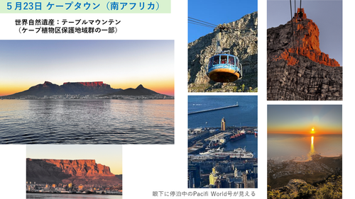 5月23日に訪れたケープタウンは見所満載の所だ。ケープタウン沖には早朝に着き、船上から朝陽に輝く荘厳なテーブルマウンテンを見ることができた。海抜1086mの頂上はほぼ平らで、そのまわりは急峻な崖になっている。頂上には大型のロープウエイで登った。頂上から眺める市街地、海の景観はすばらしかった。テーブルマウンテンは世界自然遺産:ケープ植物区保護地域群の一部を占めており、世界でもっとも植物種密度が高い場所の一つとされている。