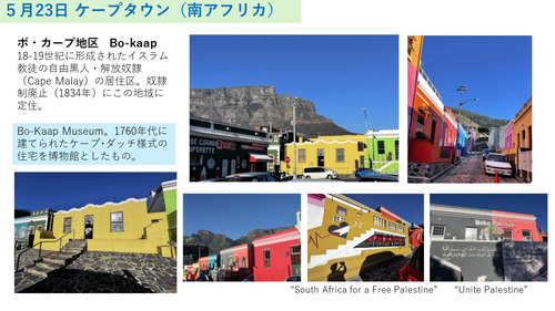 ケープタウンではこのほか、喜望峰、ケープポイント、ペンギンコロニー等を見学したが、市内中心部のカラフルな町並みのボ・カープ地区も訪れた。