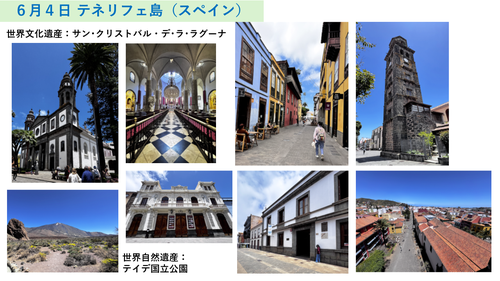6月4日に寄港したのはスペインのテネリフェ島。スペインと言っても、モロッコと西サハラの沖合、カナリア諸島の小さな島である。スペイン最高峰のテイデ山(3,718m)が海底数千mから噴き上げて形成された火山島で、海洋島火山として世界最大級という。