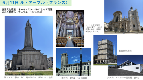再び鉄道に乗ってルーアンからル・アーブルにもどった。ル・アーブルは第2次世界大戦で壊滅的に破壞されたが、オーギュスト・ペレによって1964年までに主要部が再建され、世界文化遺産に登録されている。世界文化遺産:オーギュスト・ペレによる再建都市(Le Havre, the City Rebuilt by Auguste Perret)