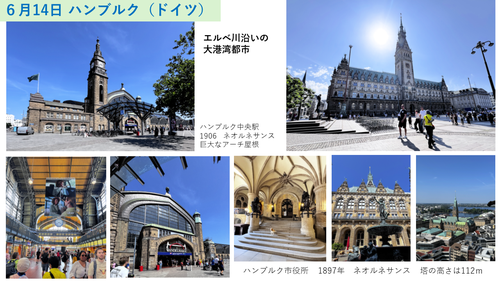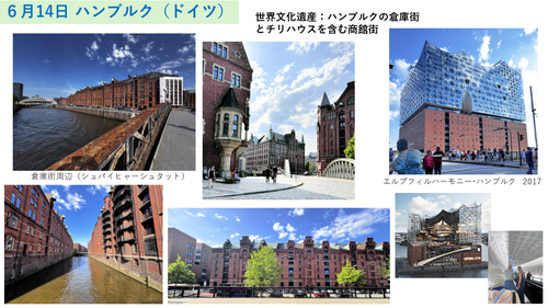 6月14日朝6時にハンブルク港に到着した。ハンブルクは北海の海岸線からエルベ川を遡ること100kmにある。ヨーロッパ最大級の河川港というが、77,000トンのクルーズ船で訪れて、その大きさや機能に驚く。さらに私たちの船より大きいクルーズ船も横を航行していた。これこそ内陸都市のハンブルクを発展させた源泉であろう。見わたす限りの広い港をコンテナ船、クルーズ船等が充満し、行き交っていた。造船業も盛んなようである。