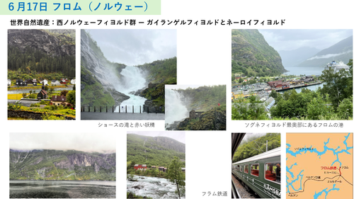 この自然遺産は氷河が刻んだ地球史の証拠と、圧倒的な自然美を兼ね備えた代表的なフィヨルド景観とされ、2つの地域で構成される。フロムがあるネーロイフィヨルド地域は延長約100km、面積約7万haにも及ぶ。最も狭いところでは幅250mしかなく、切り立った断崖と氷河が特徴的である。フロムはそのフィヨルド観光の拠点であり、鉄道駅、ホテルやレストラン等があり、巨大なクルーズ船も出入りする。前回2014年の旅ではフロムから小さな連絡船に乗り、フィヨルド沿いの小さな村で、若い夫婦がガラスを吹いてつくるワイングラスを買ったことがあり、今も大切にしている。