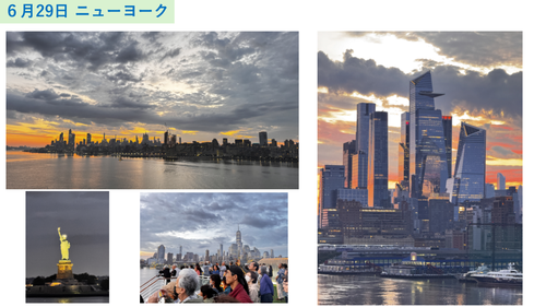 ニューヨークには6月29日早朝に到着した。ベラザーノ・ナロウズ橋(1964年開通。約4,200m)をくぐってニューヨーク湾に進入し、ライトアップされている世界文化遺産:自由の女神像(Statue of Liberty)の横を通り、次第に朝焼けで輝き始めたニューヨークの摩天楼群を見た時、乗客のだれもが歓声をあげた。心躍らせながら甲板、デッキに出て、カメラやスマホ、双眼鏡を構えた。トランプのアメリカでも、ニューヨークはニューヨークだ(笑)。
