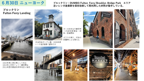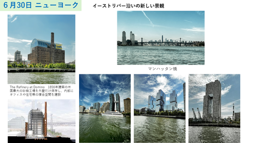 6月30日のニューヨークはまずブルックリンを訪ねた。イーストリバー沿いのEAST 34th Streetというフェリー乗り場から南へ、ブルックリン橋のたもとのDUMBO地区に向かった。フェリーは快適で、川沿いの新しいビル開発も楽しく望見することができた。特にブルックリンのThe Refinery at Dominoは近寄ることはできなかったが、遠景だけでもその保存と開発のコンセプトは理解できた。1884年に稼働した当時アメリカ最大の砂糖工場で、2004年に操業停止。その後ランドマーク指定を受け保存対象 となったという。煉瓦の外壁や煙突を保存し、内部にオフィスや住宅等の複合空間をガラスを多用して建設、屋上にはガラスボールトの空間を設けている。2017年よりプロジェクトに着手し、2023年に竣工した。周辺の公園と緑地等とも密接に連携し、公共的空間を拡大しているという。