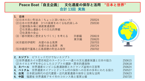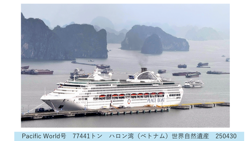 PEACE BOATクルーズは、国際NGO PEACE BOATが船会社、旅行会社と提携して、年3回の地球一周クルーズと短期の国内クルーズを1983年から催行しているものである。地球一周クルーズは現在121回目が航行中であり、12月中旬には122回クルーズが出航する。3年後の131回クルーズも募集がはじまっている。どのクルーズも平和・人権・環境保護・国際交流等をテーマとしており、他の娯楽中心の豪華クルーズとは全く異なる。これまでに9万人以上が乗船したという。