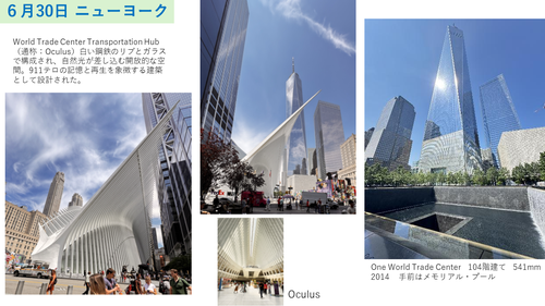 ブルックリン橋を徒歩で渡り、マンハッタンにもどった。9.11テロによって破壞された2棟のかつてのWorld Trade Center跡地は2つのメモリアルプールとなり、ブロンズ製の縁石に約3,000名の犠牲者の名が記されていた。そのプールの地下はメモリアル博物館となっており、崩壊した鉄骨や基礎などの構造物や遺品等が展示され、映像や音声記録が紹介されていた。当時の被害のすさまじさがリアルに伝わってきた。