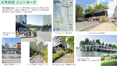 The High Lineはマンハッタン西側にあるかつての高架の貨物線跡に造られた全長2.3kmの空中公園である。貨物線は1980年に廃線となり、廃墟化し、撤去論が高まった。1999年に保存と公園化を訴える市民団体が設立され、2006年からニューヨーク市の予算で緑化等の整備が始まったという。2009年に一部完成、2019年には全線完成したという。現在、公園の運営管理は保存と整備を訴えた市民団体が担い、年間数百万人が訪れる観光地になっている。