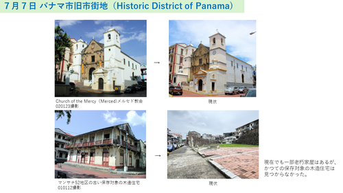 私は2000年と2001年に東京文化財研究所の国際協力事業に関係して、この地を訪ねたことがある。パナマ政府の要請によるパナマ歴史地区の文化財保存修復協力事業について、私が属していた文化庁建造物課も加わることになったのだ。直接的には当地のメルセド教会の石造外観の修復やマンサナ52地区の木造家屋の修復を目標としていた。メルセド教会は1673年、パナマ・ビエホ地区から石材を運んで、建設中であったパナマ歴史地区に建てられたもので、バロック様式の正面に両側に白い塔が建つ外観であった。2000年当時はやや傷んでいたが、その後内外とも修理・補強され、現在は安定した状態になっている。修復対象であった木造家屋は現場付近では見つけられなかった。