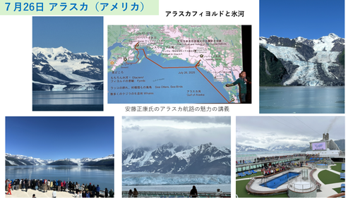 この間、26日、27日はアラスカのフィヨルドや氷河の景観を堪能した。船がいくつものフィヨルドの最奥まで航行し、多くの雄大な氷河を真近で見ることができ、その先端の氷の崩落の音も聞いた。