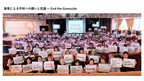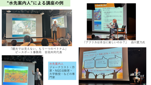 「水先案内人」と称して、世界各地の識者やジャーナリスト、パーフォーマー、芸術家、寄港地の専門家、活動家グループ等が途中から乗船し、興味深い数回の講義や説明、パフォーマンス等をして、次またはその次の寄港地で降りていく。それらの水先案内人は約40人・グループを数え、その講座・公演は1日に数イベントとなることもあり、私たちは大学の授業を受けるがごとく、キャンパスではなく全長220m余の船内を走り回った。数百人収容の2つのホールがしばしば満員となった。水先案内人の内、外国人・グループは22であった。これらの講演などは、話者が日本人を含めて各国にわたり、また乗客の国籍もいろいろなので、ボランティアの同時通訳で日本語、英語、中文、韓国語で伝えられた。講演等のテーマは多岐にわたり、たとえば「海のシルクロードと一帯一路」加藤千洋、「アフリカは本当に貧しいのか」品川夏乃、「世界遺産から読み解く地球と人類の歩み」吉岡淳、「パレスチナの今」ルーシー・ヌセイベ、「戦時性暴力を許さない:声をあげるウクライナの女性達」SEMAウクライナ等々多数あり、書き切れない。駐日ジャマイカ大使のショーナ・ケイ・リチャーズさんの「ジャマイカ 核兵器廃絶への力強い声」や、駐日ベネズエラ大使の妻であり、ソプラノ歌手であるコロンえりかさんの「手歌のワークショップ」やすばらしい歌声も忘れられない。関連のダンスや演奏もたびたびあった。昨年ノーベル平和賞を受賞した日本原水爆被害者団体協議会(被団協)の人たちによる訴え・報告・展示などもあった。