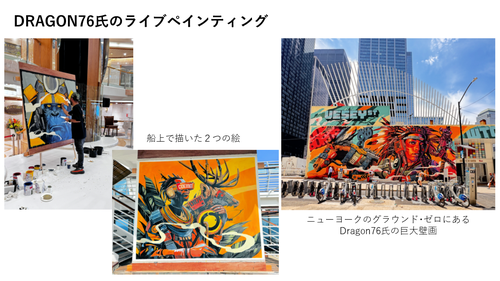 ニューヨークにアトリエを持ち活躍している日本人の壁画ペインター、DRAGON76氏も水先案内人として乗り込んできた。彼は船上で大きな2枚の壁画をライブペイントで描き上げた。船上オークションで販売し、その一部は被災地への寄付にあてられた。ニューヨークではグランド・ゼロの地域に巨大な壁画を描いているほか、あちこちで彼の作品を見た。彼は滋賀県日野町の出身で、たまたま私の修士論文のテーマの一つの町だったので、夫人も加わって盛り上がった。