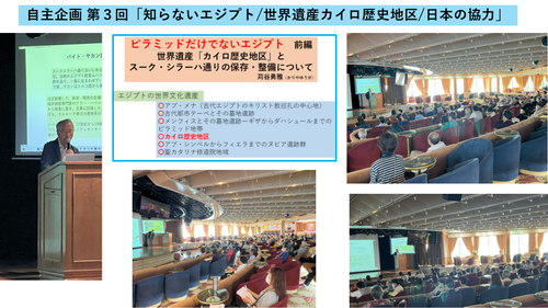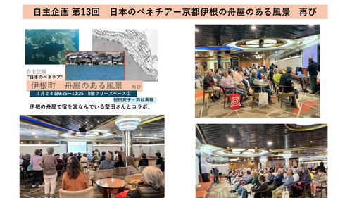 私は「文化遺産の保存と活用」をテーマに、日本と世界の文化遺産についての講義を行った。一定の人の関心を集めることができ、それなりに満足している。京都府伊根町の舟屋については、乗客の一人で伊根で宿を営んでいる女将さんとコラボで2回発表できたのも楽しかった。