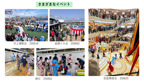 こうした水先案内人による講義や自主企画だけでなく、船内では、プロの音楽家によるギター、カルテット等のライブミュージックが絶えず流れ、朝のラジオ体操、ヨガ、ズンバ、そして英語、中国語、韓国語、インドネシア語等の語学講座、浴衣を着ての縁日や盆踊り、運動会、仮面舞踏会、ファッションショー、歓迎会、誕生会、楽器演奏会、国際演芸会、星空・プラネタリウム鑑賞等々も行われた。楽器を使う演奏会等のために、ウクレレなど持参した楽器や船内で購入した楽器で朝早くから練習にいそしむ乗客も多数いた。琴やマリンバ、チェロ、太鼓等の大型楽器を持ち込んでいた人がいたのにはびっくりした。和服を10枚も用意して船内や寄港地の街を着て歩く人もいた。
